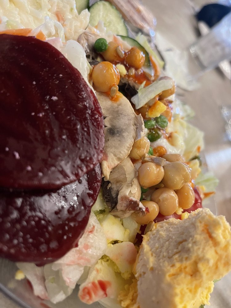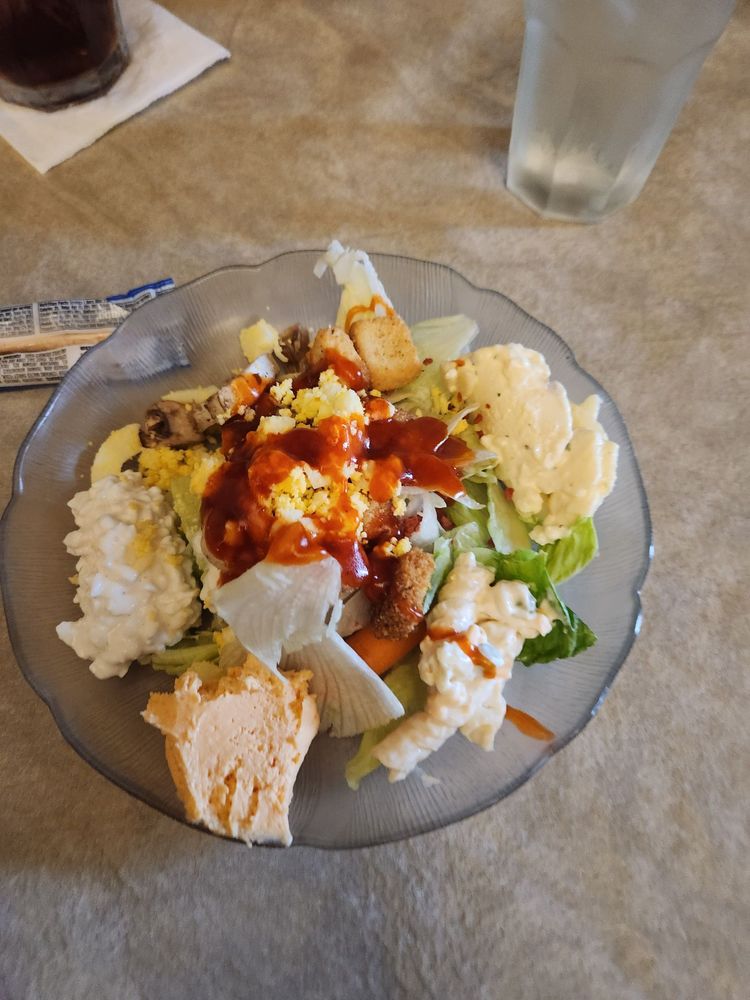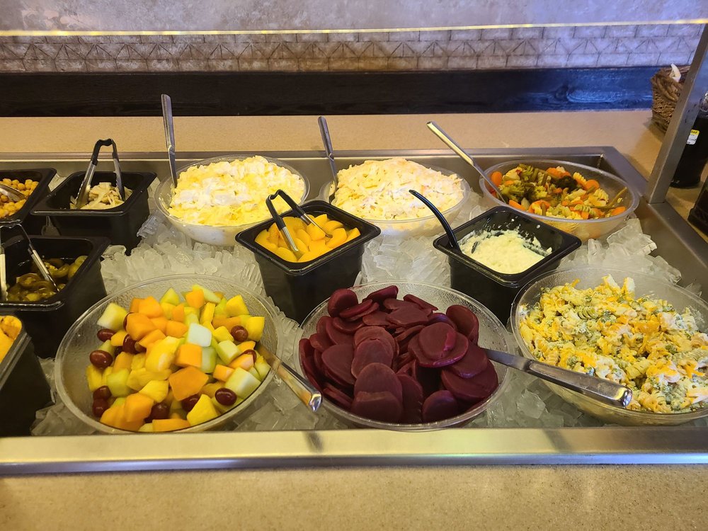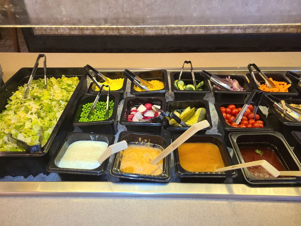A wide variety of salad greens, relishes, fresh vegetables assorted salads and two hot soups for
